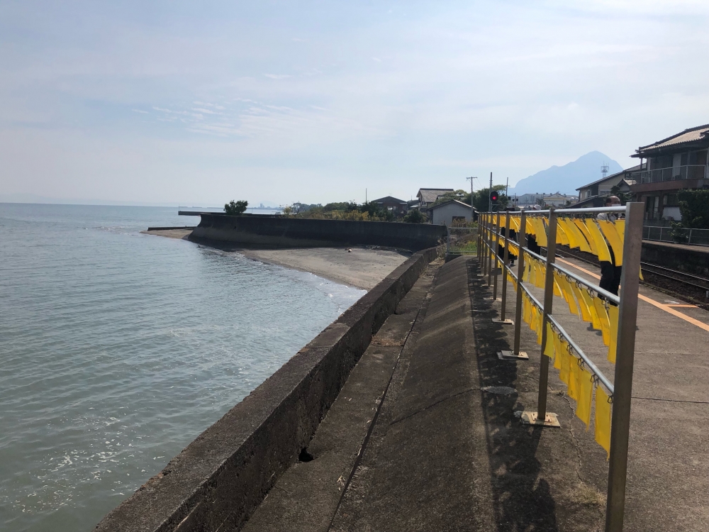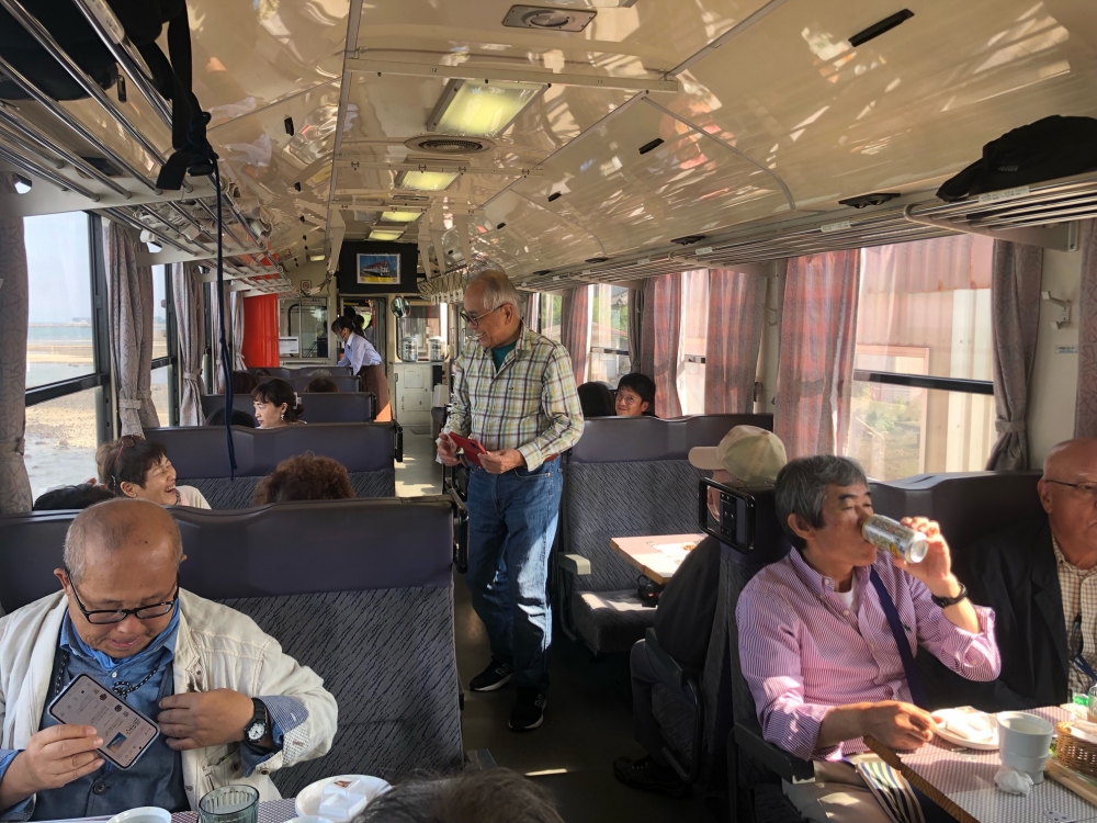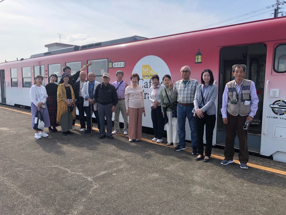 参加者14名、今回は諫早駅より「しまてつCaféトレイン」に乗車し、島原駅までの約2時間、沿線のお店の美味しい食事と車窓からの風景を楽しみました。途中停車の大三東駅では幸せの黄色いハンカチと青い海のコントラストに癒されました。通常より速度を落として運航された列車からは、普段気づかない様々な発見があり、ゆったりとした時間を過ごしました。