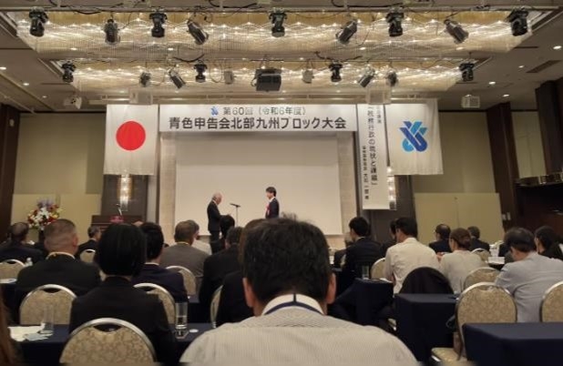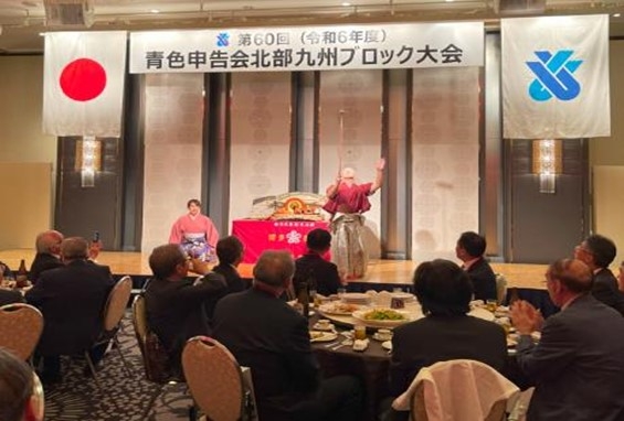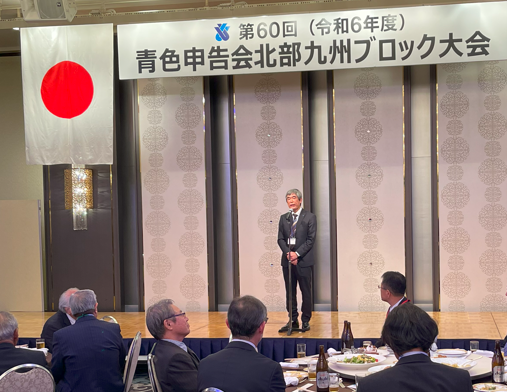 祝賀会では、福岡国税局の大石局長より「税務行政の現状と課題」という演題 のもと、日本における財政の現状とコロナ禍を機にさらに活発になったDX化への 取り組みによる税務行政の将来像についてご説明をいただきました。 また、講演後には北部九州青色申告会連合会の 梅原会長が「デジタル化宣言2024」として、会員企業のデジタル化をさらに推進 する宣言を行い、税務当局との一層の連携協調を図ることとしました。