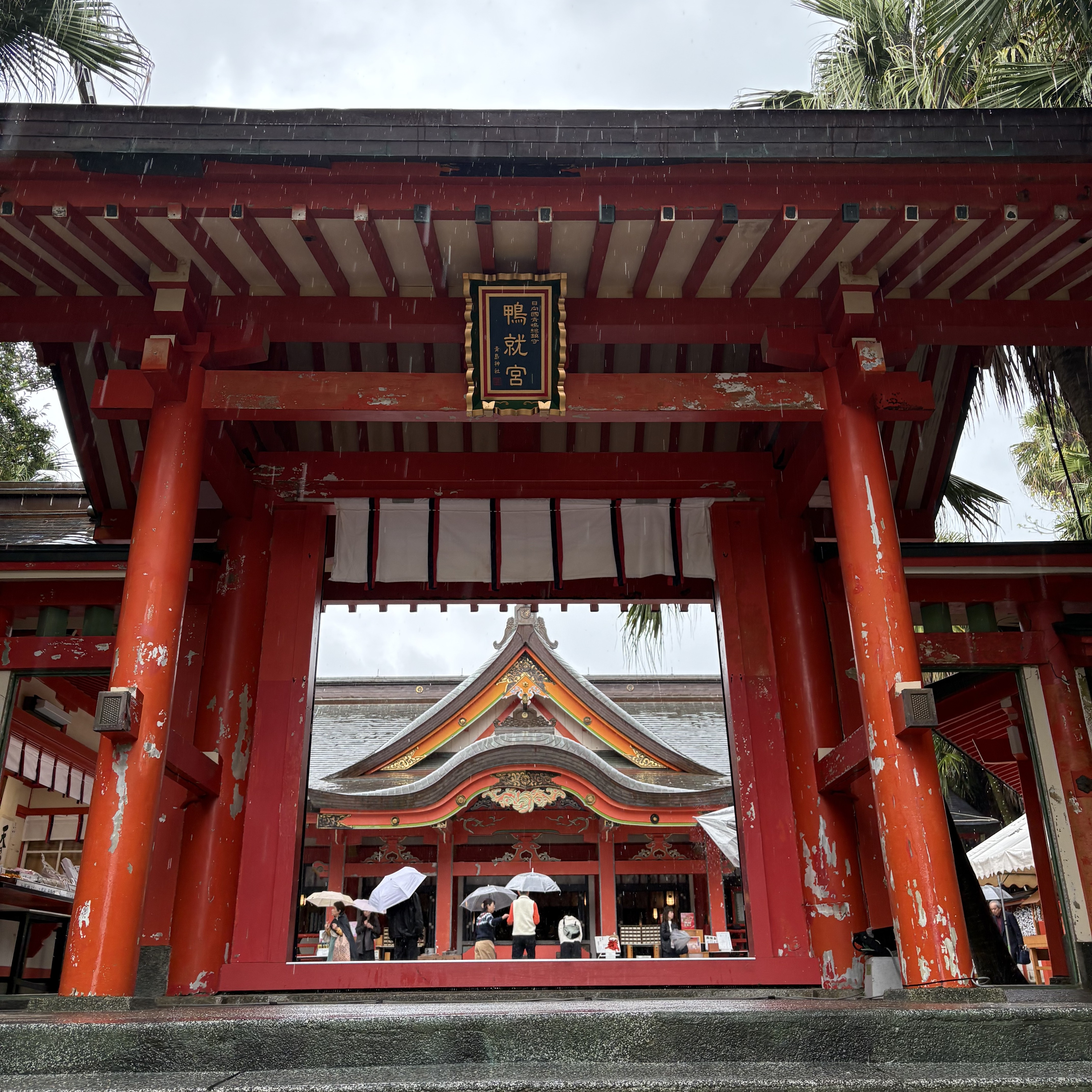 観光では、青島神社と霧島焼酎の工場見学を行いました。青島神社では、あいにくの雨で衣服が濡れるほどでしたが、雨に映える鳥居や堺内のしっとりとした雰囲気が印象的で、趣を感じることができました。